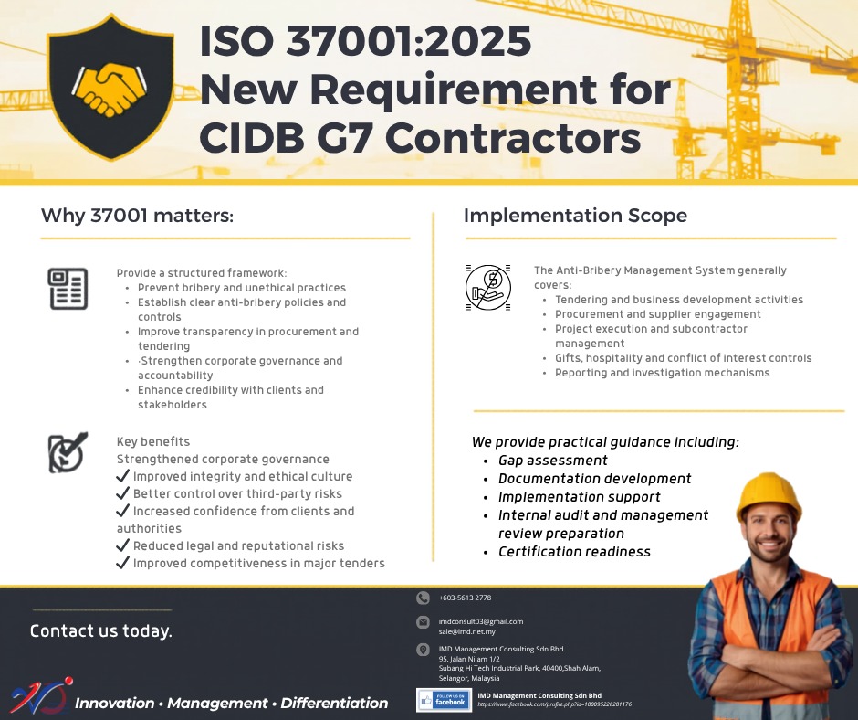 The Construction Industry Development Board (CIDB) has introduced MS ISO 37001:2025 Anti-Bribery Management System (ABMS) as part of the governance and integrity strengthening initiative for contractors, particularly those under Grade G7 classification.